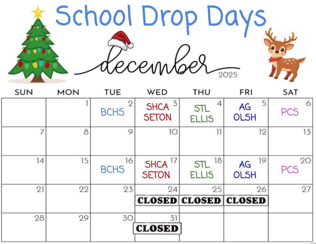 School drop is a free delivery service offered to the following schools: Bishop Canevin, South Hills Catholic, Seton, St. Louise, Ellis, Archangel, Our Lady of the Sacred Heart, & Parkersburg Catholic School. School drop is only available from September to April. When available, there will be a school drop option shown at the checkout page. School drops are done every other week and are completed in the morning of the scheduled drop day.